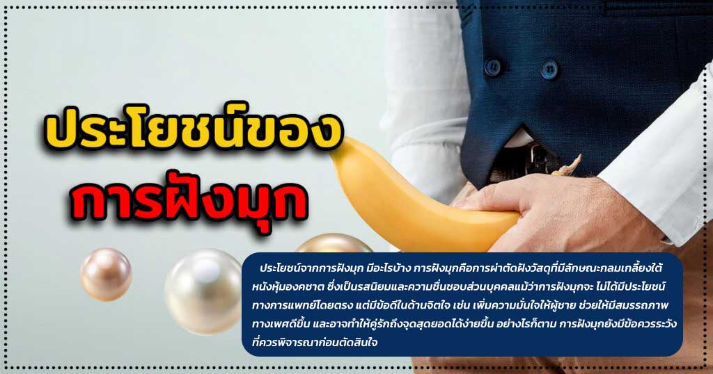 ประโยชน์จากการฝังมุก มีอะไรบ้าง การฝังมุกคือการผ่าตัดฝังวัสดุที่มีลักษณะกลมเกลี้ยงใต้หนังหุ้มองคชาต ซึ่งเป็นรสนิยมและความชื่นชอบส่วนบุคคล