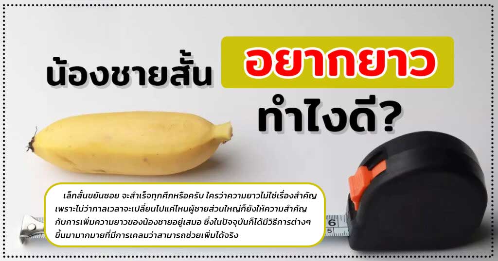 เล็กสั้นขยันซอย จะสำเร็จทุกศึกหรือครับ ใครว่าความยาวไม่ใช่เรื่องสำคัญ เพราะไม่ว่ากาลเวลาจะเปลี่ยนไปแค่ไหนผู้ชายส่วนใหญ่ก็ยังให้ความสำคัญกับการเพิ่มความยาวของน้องชายอยู่เสมอ ซึ่งในปัจจุบันก็ได้มีวิธีการต่าง ๆ ขึ้นมามากมายที่มีการเคลมว่าสามารถช่วยเพิ่มได้จริง